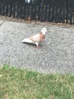 Pigeon has been hanging around the parking lot of my office building. Has bands on both legs so we presume he belongs to someone.Pigeon will not let anyone get close enough to read the bands.