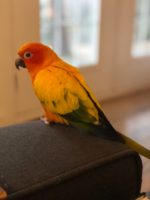 Found a sun conure outside my house yesterday. Very friendly and well trained. Has a band.
