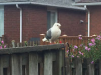 We found a bird eating the birdseed in our backyard on the 14th. It is white with a tuft on its head, and grey parts on its wings with 2 black stripes on them. It also has a yellow band around its left leg.