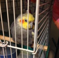 Someone on nextdoor found this weakened cockatiel in her yard. The weather has gotten rainy and cold recently, not sure how long he or she has been loose. Fully flighted, has been eating and drinking a little. Does not seem to be scared of people but does not like being handled, not sure how much of this behavior is because of his weak state. Has not vocalized just yet. Has a bald spot behind crest, could be injury or typical.