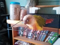 Tame, loves attention and to be out and about rather than in a cage, looks young. Does not talk but makes noises. Loves grapes, apples, blueberries, cantaloupe, cheese. Wings are not clipped.