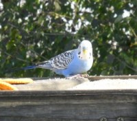 Same light blue/white face parakeet/budgie SEEN yesterday, seen at same millet feeder. Allowed close approach, showed no interest in Ritz crackers I’d placed on the feeder earlier (just a test), very hungry for the white millet.