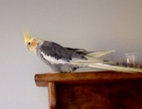 grey markings behind orange cheeks on both sides. male (ie solid tail feathers underneath) with white under-wings, light grey belly with yellow in the middle of belly. Dark grey back, likes to whistle back when you imitate him or when someone sings