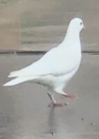 White pigeon or dove we are not sure. But it’s hanging out in our patio and expects us to feed it. Is not going anywhere. Seems to be able to fly and walk without any