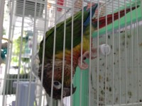 July 8-13-Pretty green cheek conure with a pinky/peachy chest and bright red belly was found in our front yard last evening. It is very friendly, flew down from the phone line to my hand full of peanuts and I was able to pick it up without resistance. It seems young. We got a cage for it and parrot food – it is eating and drinking and seems in good shape. Loves peanuts (unsalted) and skinless apples and sunflower seeds. It has a band that has three letters, beginning with the letter H. Please contact me if you think that this is your little guy. Thanks. -DD Fallon