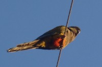 Sighting: the color of the bird is green with orange or yellow on the stomach. The Bird came back to the power lines across the street. I have the feeling the bird goes for the cat food in the driveway. Fortini Rd, San Jose South