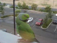 The bird perches on the windowsill of my office building on Warm Springs and Gillespie. I have spoken to him through the window and he seems comfortable with people. He tends to nap on the windowsill, then groom and then disappears for the remainder of the day. I am concerned for his well being since it will begin to get cold out.