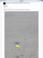 I saw a post today on FB of a girl who saw a yellow parakeet it was very friendly and then flew off when she tried to capture it…see attached post/screen shot. She lives in Edmonson Pike area in South Nashville 37211 on Avery Park Drive…I also posted a courtesy listing in Craigslist too.