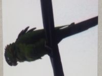 What appears to be a green conure has been sighted at a feeder of mine and on powerlines and antennas nearby each morning. Do not know how to catch a bird, but this is someone’s bird. Photo not the best as it was just before rainstorm at dawn. 262-374-0646