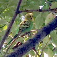 We saw this budgie in our front tree this morning, Pharmacy and Lawrence, Toronto.