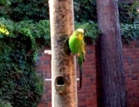 This sweet little parakeet green/yellow  joined the backyard sparrows at the feeders on Wednesday evening, August 27th 2014, and returned for breakfast the following day on the 28th. The bird appears healthy and is flying well.