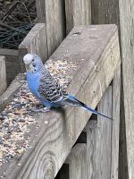 A beautiful blue parakeet/budgie was feeding at my bird feeder in Calverton, New York, this afternoon. No injuries that I can see, but clearly a pet – silver band on left leg. I was able to get fairly close but not close enough to catch him. Tried to coax him into a carrier with birdseed and audio of budgie calls; he was interested but unfortunately it got dark, so I’ll try again tomorrow.