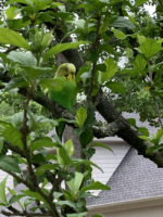 Yellow/Green parakeet, blue tail, friendly but wary, is very fast and has not been able to be caught