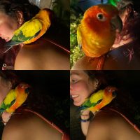 Banded sun conure. Very good shape, friendly, does not seem to speak words but very friendly.