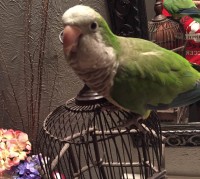 Quaker Parrot, Green with greyish neck and breast. Very sweet. Looks healthy and well cared for. No leg band. Has all of it’s flight feathers, none of the feathers appear to be clipped. Flies very well around our house. Flies off then returns to land on our hand. So far only squawks. Has not tried to whistle or talk but very sweet and tame.
