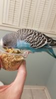 Very sweet. Doesn’t fly. Found behind the Bob Bowers civic center near the dumpsters. Super sweet blue Male budgie. Banded. First 3 letters on band : PST – must provide numbers for proofs of ownership.