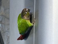 Non-Trained, tame, younger green check. Has one distinctive feature and a particular behavioral characteristic, for which the rightful owner would mention when identifying.