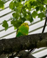 Found green/yellow parakeet in my backyard. Young (still has some head striping and maybe a partially clipped wing?). Think it is a male. Currently in a cage with food and water at my house. Spent a few days outside in the pouring rain from what I can tell, but seems in good spirits at the moment. Looking for whoever is missing this boy.