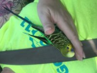Small budgie, friendly and can handle easily. Seems to be unable to fly much but wings are not currently clipped.