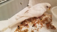 Budgie-all white, reddish eyes. Missing talon on right outer toe. Seems to have a nervous/skittish personality so far.