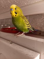 Found this little bird sitting outside on the hood of one of our cars late on the 15th, climbed right onto the first hand that was offered. Underside is green, back and head are yellow with black details, tail and largest cheek marks are a dark blue, smaller cheek marks are black, has 2 on it’s left cheek and 3 on it’s right cheek. Pretty friendly, just a bit scared, trying to find it’s home!