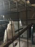 Mostly white, grey on wings and tail. Called to us and then landed on us in our backyard. Friendly but no to hands.