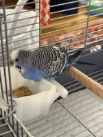 A blue parakeet with black and white tiger stripes on its face and wings. Blue cere, light colored eyes, and a silver band on his left foot. He?s got one face feather with a big dot on one side and 2 on his left side. Someone managed to capture this sweet budgie on a sidewalk across from Watertown boys and girls clubs and he?s now safe with me in a cage with food, water, and toys. He seems to be hand tamed, very tired, has a bruised beak. Probably at least 1 year old if not older based on head stripes and the ring of color around his pupils.