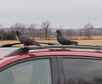 Sighted at Brooklyn Wildlife Area, County Highway DD South Parking Lot – Two pigeons or doves had bright green bands on their right foot, feathers are mostly dark grey. They were sitting on cars in parking lot for hours. Could not see information on bands and could not get them someplace safe, as they were skittish around people. They were still more curious than wild pigeons should be of people in a more rural area.