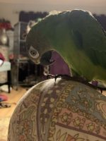 He’s only partially flighted, very loving and friendly. He has beautiful white eyes, smoky grey head and a green body with vibrant blue under feathers. He loves giving kisses and answers to Smokes, Smokie and kissy noises. Please keep your eyes and ears out for a frantically crying scared feather baby, he’s so very loved.