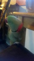 Alex is aprox 2 ft from beak to tail. Big red/orange/yellow beak. Mostly green with black and pink ring around his neck a little red on his wings and blue red and yellow on his tail. He knows MY NAME and lots of other words. If you hear a strange alarm sound thats Alex mimicking the city bus he is used to hearing them beeping every morning