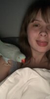 Fiji has been free flight for about 6 years and is 10-12 years old. She was fully grown when I got her so her exact age is unknown, but I’ve had her for 8. She flies fine indoors but she’s never flown outside before. She has a silver band on her right foot, but the characters are too faded to read. She has many different phrases she likes saying. When she’s in a playful/curious mood, she’ll say “whatch’ya doin pretty girl?” She pins her eyes when she sees me and does the chirping thing female Ringnecks do with their mates. She is very attached to me and does not trust anyone else. Use extreme caution if you see her – she will very likely try to bite you. She loves crackers.