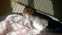 cookie has a gray body ,some white feathers on both wings , at the moment she is molting so she doesn’t have any tail feather yet,she has leg ring (silver plastic)with 02 on it.
