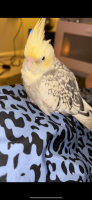 She is yellow/white/grey light red cheeks. The patterns on her wings are very detailed and she has a bit of pink paint on her wing and head. She makes the same pitched noise. Loves to sit on heads.