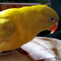 Bright yellow lorikeet, red beak, red cheeks and red on underside of wings. Tame and friendly bird, always seeking attention from family. Most likely stressed being away from family.
