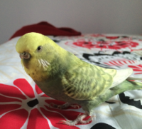 She is a tame budgie. Green and yellow with a tinge of blue. She has a tiny blood stain above her nostrils. On her cheeks are splotches of white feathers. If found please keep in a safe, enclosed “cage” or container with budgie seed, water and good ventilation.