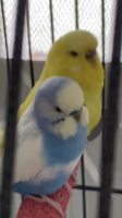 Blue and white budgie, friendly and tame and will walk to humans if hungry