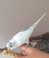 Sunshine is a white budgie with a blue splotch in her back and a slightly black head. She doesn’t have a band and no microchip. She is only a few months old and has unclipped wings. She may be found with another budgie named Peanut who is a blue budgie the same age as her. We believe that she is a girl and espcaed the laundry by chewing through a flyscreen door. She is not exactly finger trained but will step on if offered millet. Is a little jumps so quiet and clam is the best way to approach her. She escaped on the 7/09/20 .