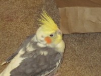 JD is a 14 year old male cockatiel. His right foot has a bent toe. He has a delightful personality – loving and friendly and loves to give kisses and dance. I miss him terribly. He was hand fed from an hatching.