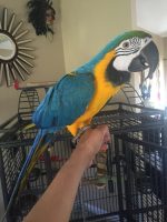 Max is mostly spoken to in Spanish, he mimics phrases like “vente papi” and “que rico”. He does not have his wings clipped.