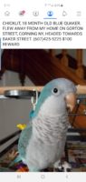 18 month old blue quaker, wings are not clipped. She flew away from my home in the rain before breakfast.