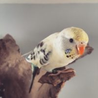 Cher is mostly white with black, blue, and yellow markings. She is really friendly and will likely land on someone’s shoulder or head.