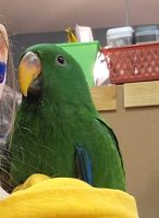 Less than a year old. Super sweet but can be skittish. His tail feathers are orange tipped. Beak has not fully turned orange/yellow, it still has black streaks towards the top of his beak.
