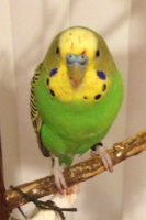 Small Green parakeet with yellow on his head with yellow and black wing feathers with blue tail feathers and has a blue cere (nose). His name is Pretty Birdie, does talk and says his name, also says the name Fluff Stuff-name of my other bird. He is friendly and shy. Last seen at home around 10:10 am on November 23, 2013. if found please contact Breanna at breanna.moore4@yahoo.com