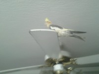 He has a raggedy tail and smaller crest feathers than normal cockatiels. Very tame and will onto your finger. On to of his head below crest he has some grey feathers. (A grey spot on top of his head).