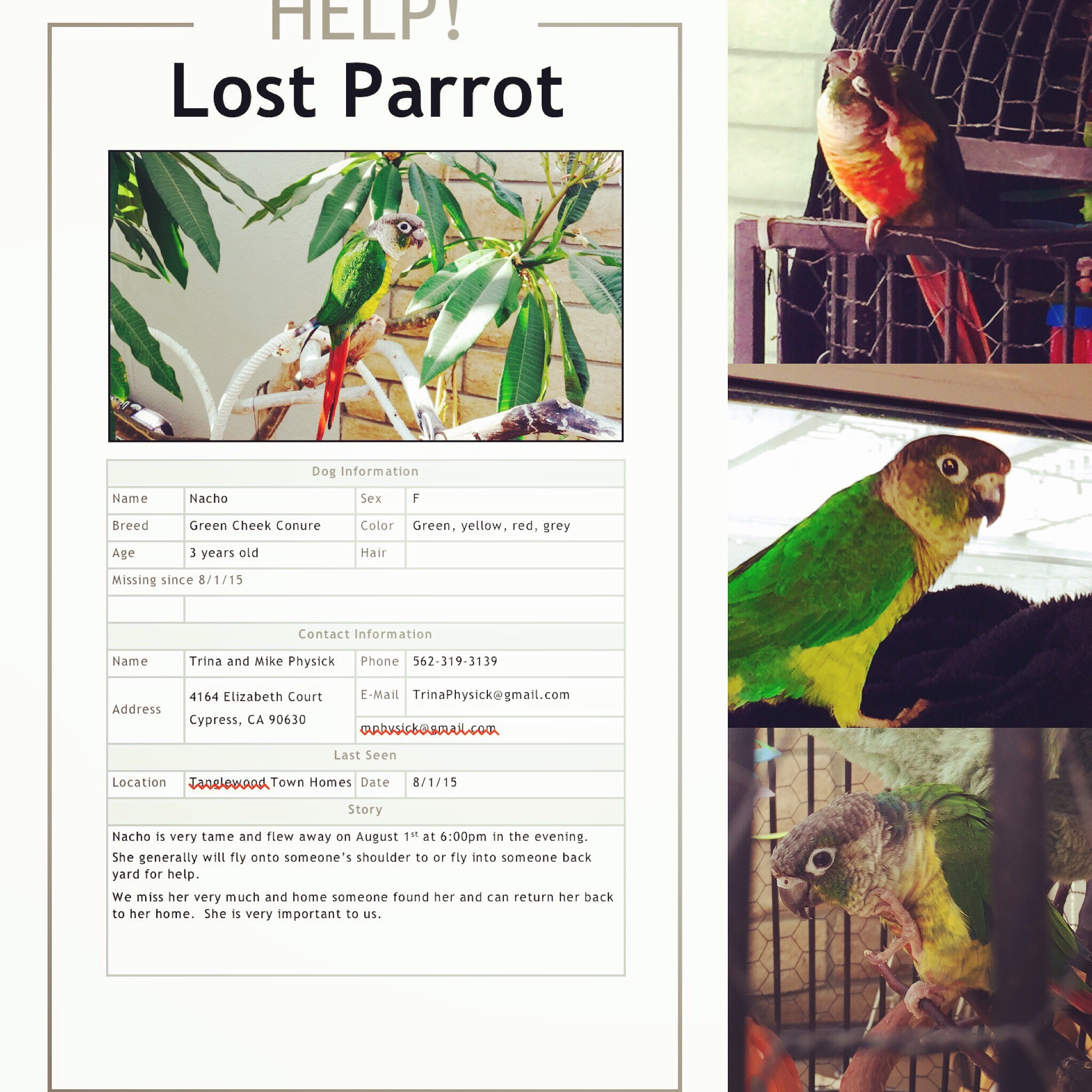I hand fed her when she 6 weeks old. She is the coolest green cheek ever and I am praying someone found her.