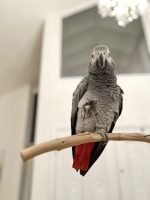 Grey parrot with a red tail. She is not clipped. Makes whistling noises and car beeps. She talks but will likely not talk without me there.