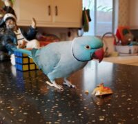 Light blue male Indian Ringneck with 2 white feathers on his left wing. Has a red beak and black ring around neck. About 12 inches in length from top of head to end of tail feathers. Does not speak, but makes sounds similar to a squeak toy. Will respond to sound of squeak toys or sounds of Indian Ringneck videos.