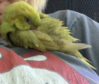 Bright green, right now one foot has claws shorter than the other as we were trimming him when he escaped.
