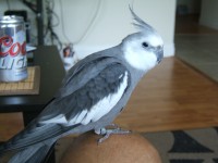 He is a small, male, 16-year old white-faced cockatiel. White face, grey body with white stripes on his wings. He whistles, knows his name, is friendly but doesn’t like to be grabbed.