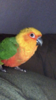 ‘Meow’ is usually very vocal. He had a small crack in his beak. We have had him for about 5 years and he has never flown away. Please help get our little guy home